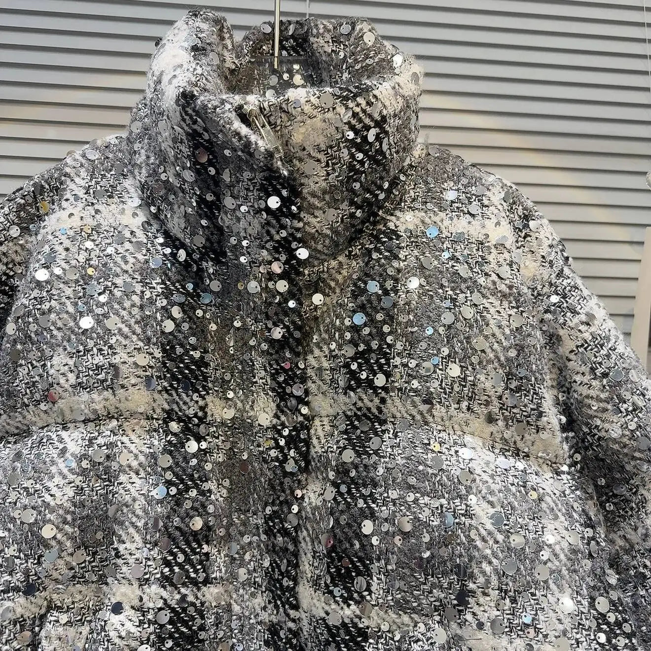 A shimmering turtleneck puffer jacket with full sequins, a wide-waisted fit, and a bold winter-luxury finish.