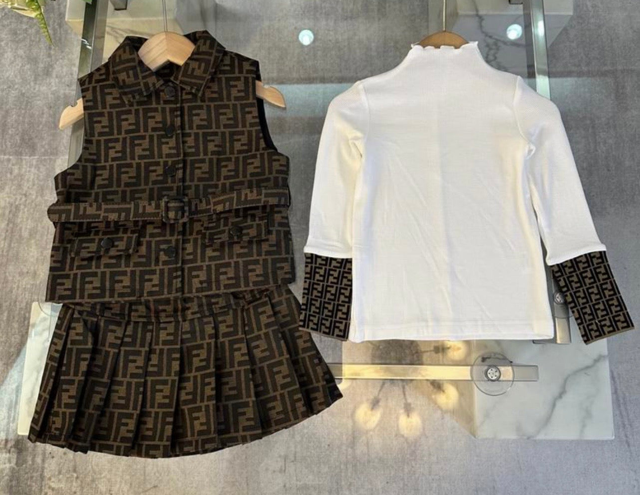 Give her wardrobe a luxury-inspired upgrade with this stylish 3-piece monogram set. Designed for comfort, durability, and standout style, this outfit includes a detailed belted vest, a pleated A-line skirt, and a soft long-sleeve top with matching monogram cuffs.
