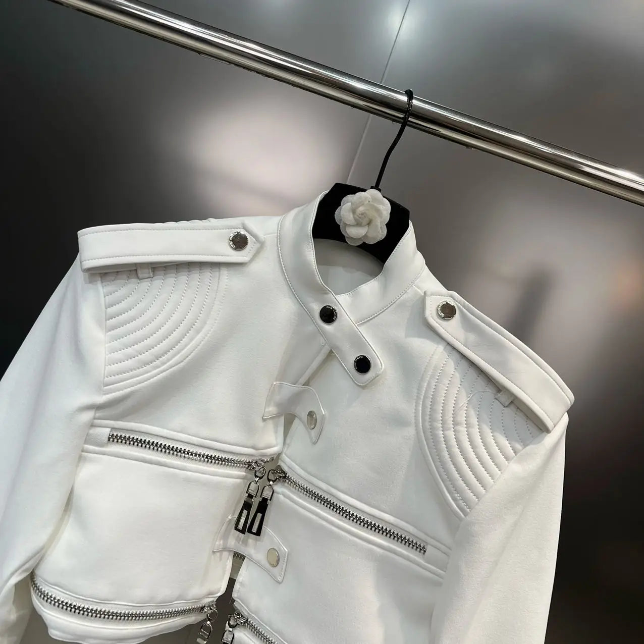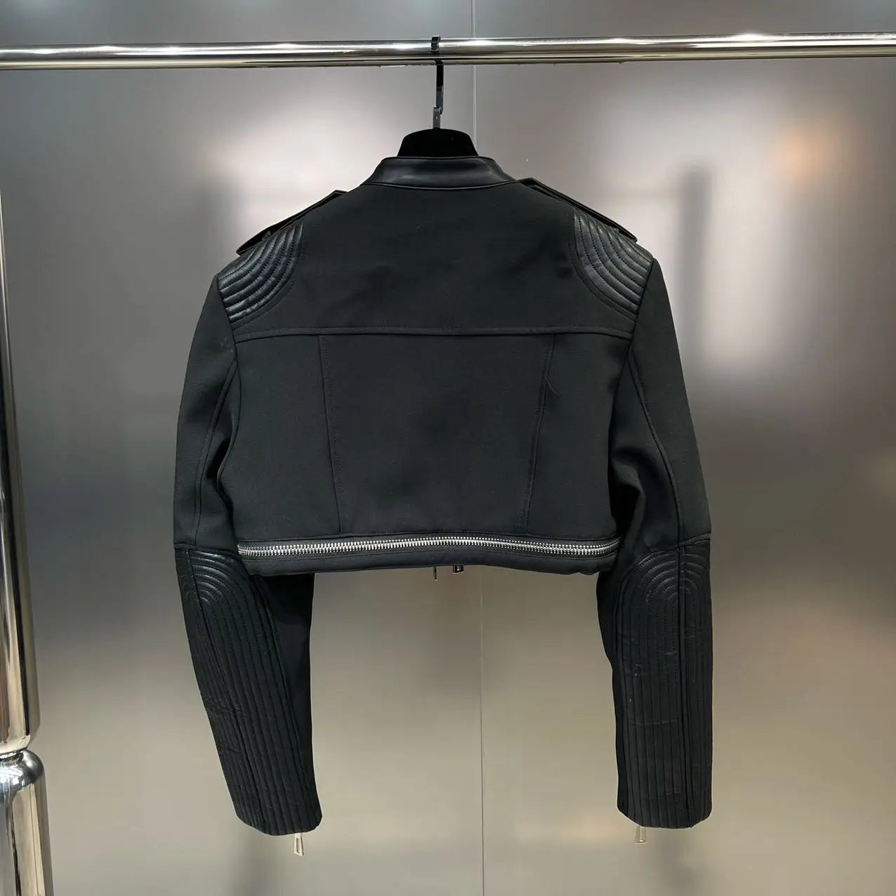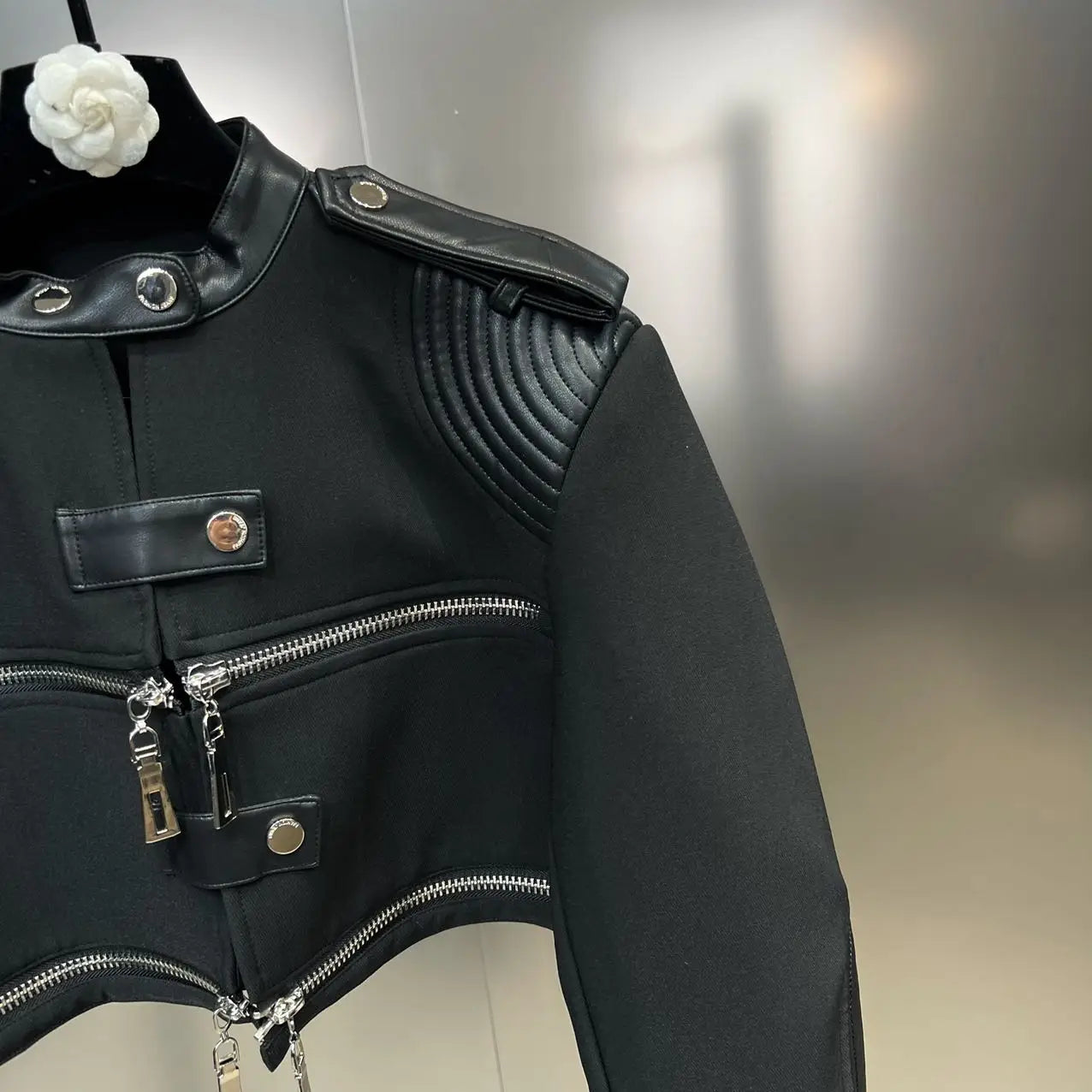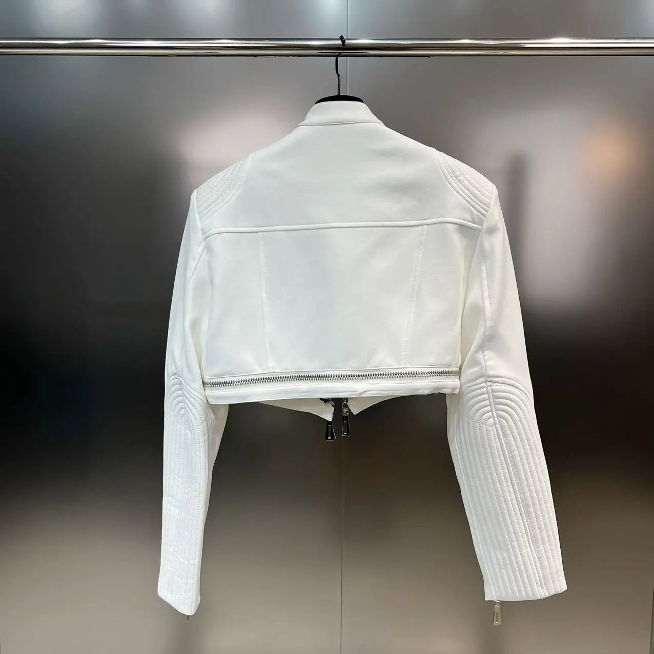 The Cropped Moto Jacket features a sculpted stand collar, paneled faux-leather construction, exaggerated shoulders, and premium metallic zippers placed for both function and aesthetic edge.
