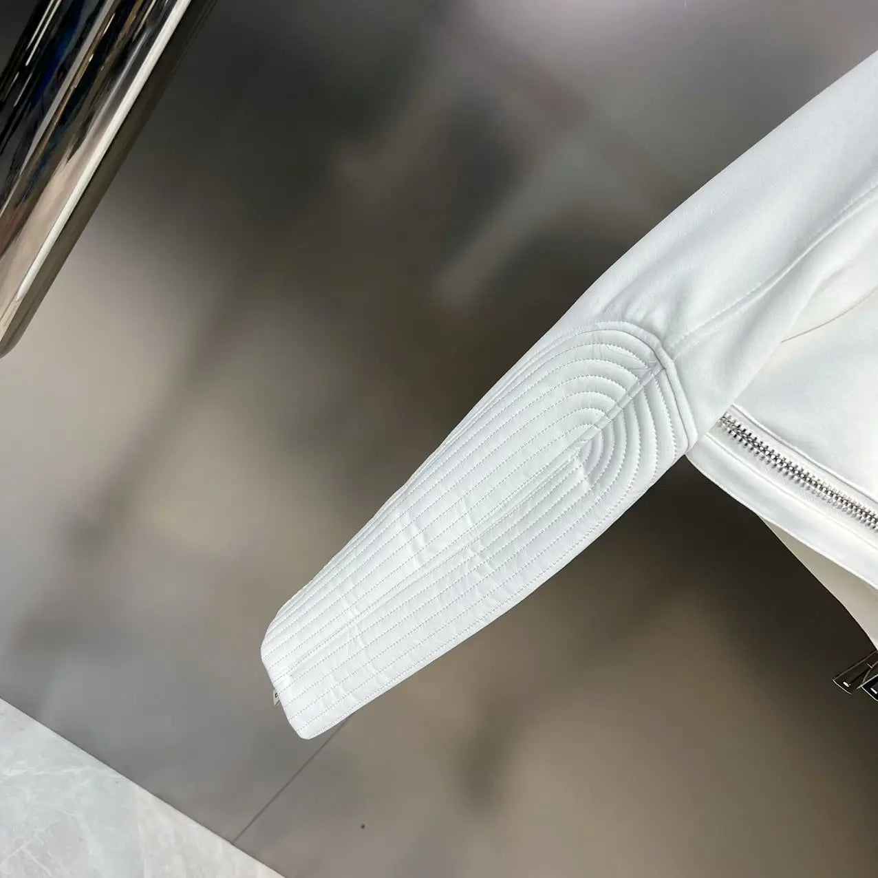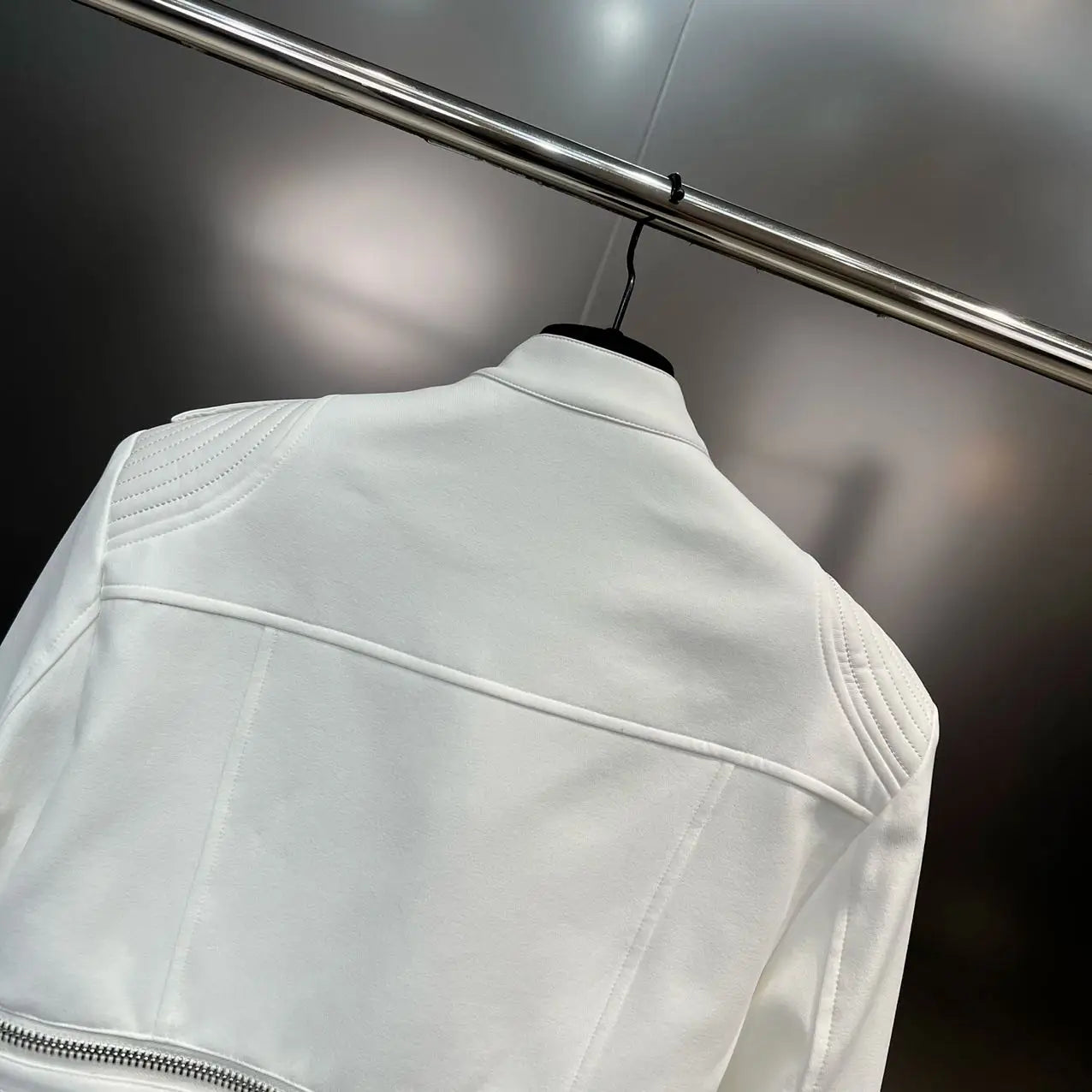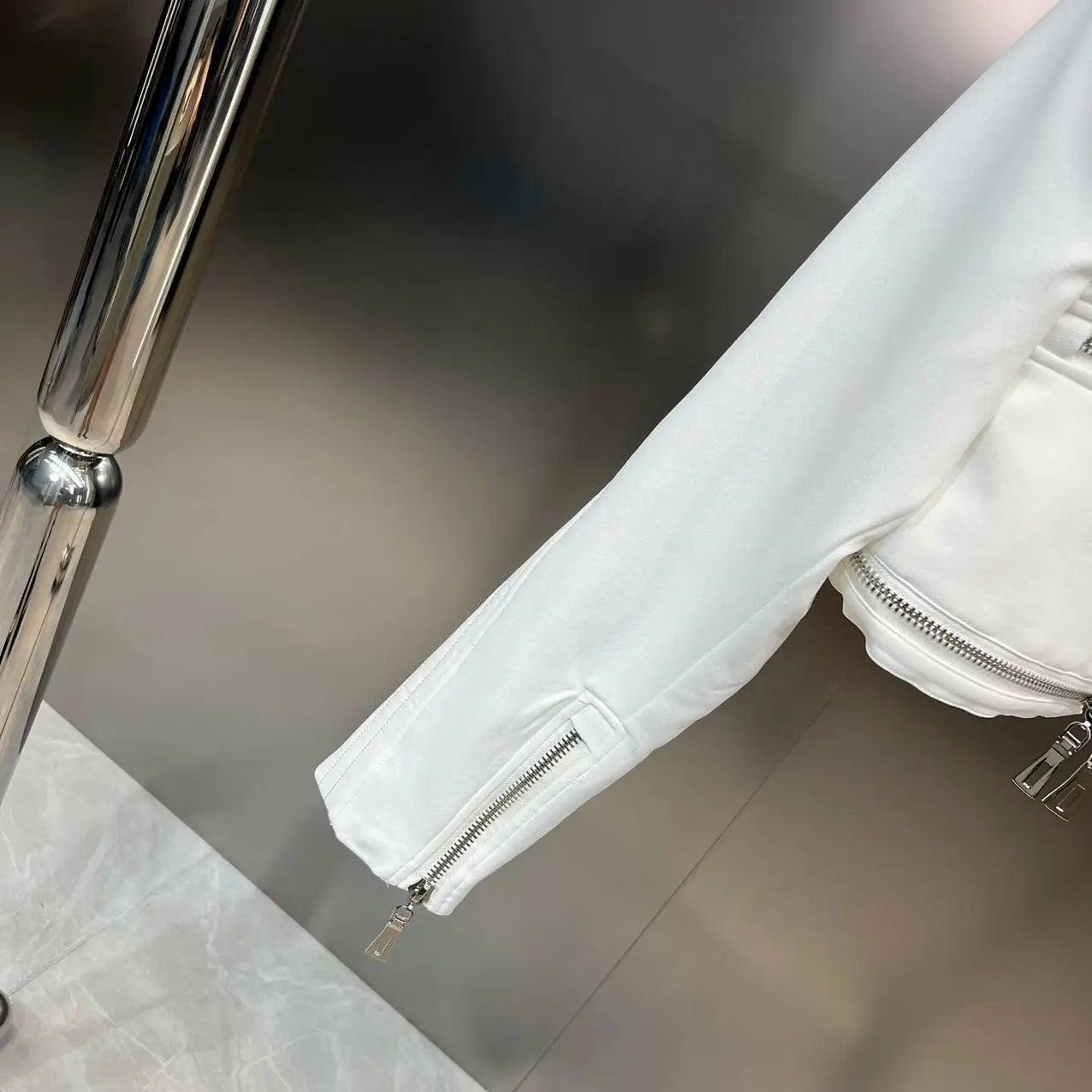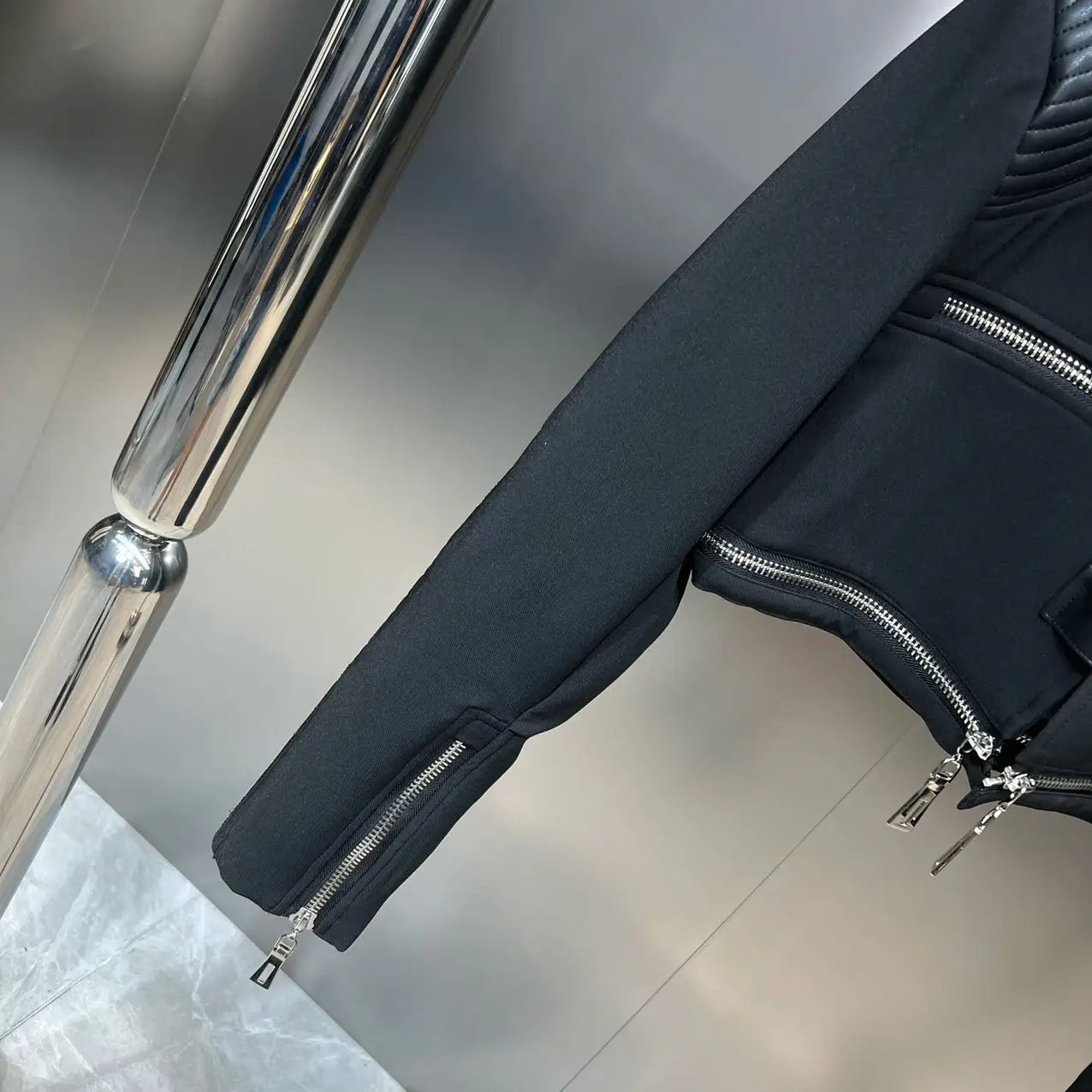 The Cropped Moto Jacket features a sculpted stand collar, paneled faux-leather construction, exaggerated shoulders, and premium metallic zippers placed for both function and aesthetic edge.